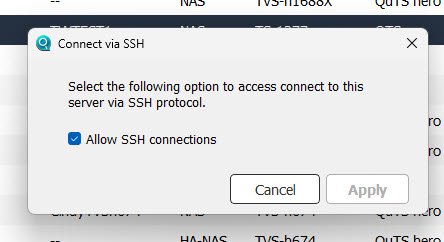 You can enable and disable SSH connections on your QNAP device. To connect to a QNAP device via SSH, see How do I access my QNAP NAS using SSH?.