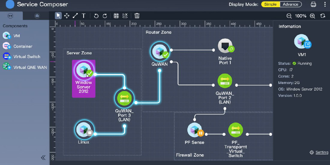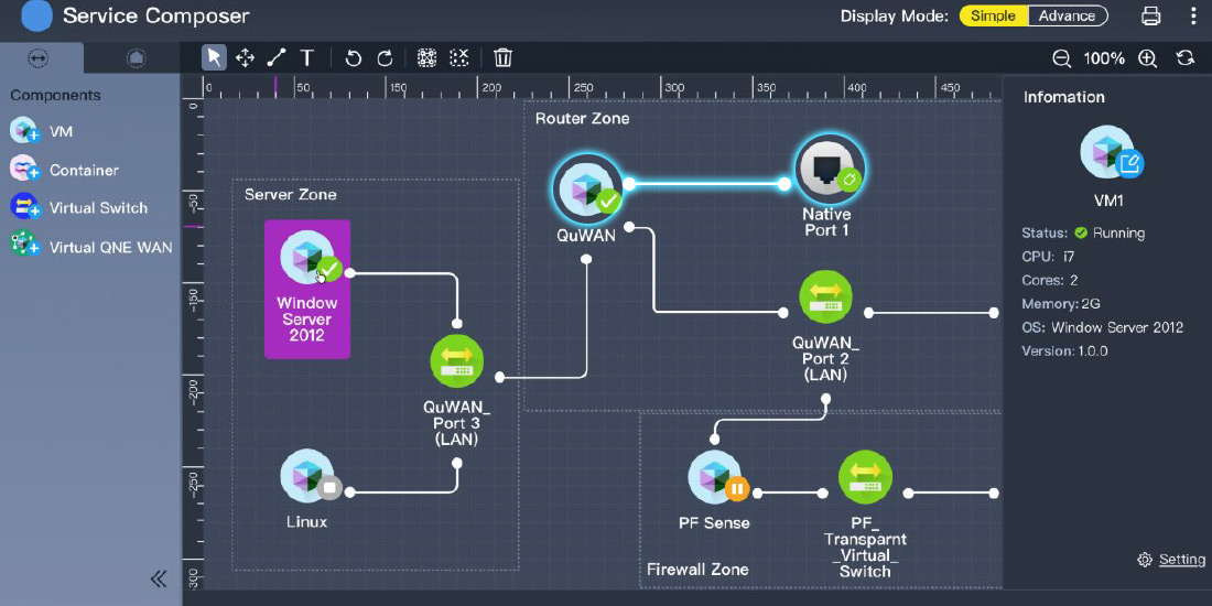 The QNE Network OS offers the innovative Service Composer for chaining virtual networks, systems, and services. With a visual network topology and intuitive drag-and-drop operation, the Service Composer helps IT administrators efficiently deploy virtual network services on QuCPE Network Virtualization Premise Equipment, thus accelerating enterprise network infrastructure deployment.