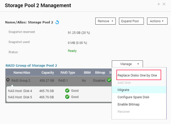 5. Select a disk to replace. (Ensure that the capacity of the new disk is greater than the capacity of the disk that it is replacing.)