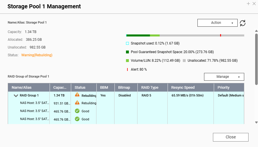 3. The NAS beeps twice. The NAS beeps twice. Then the status of the disk and RAID group change to Rebuilding. Wait for RAID rebuilding to complete.