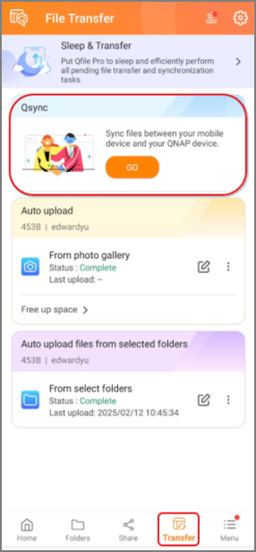 1. Open Qfile Pro on your mobile device. Go to the Transfer page and select Qsync.