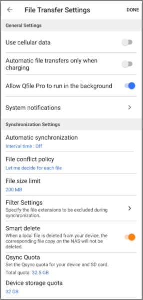• Automatic synchronization (Android only): Automatically sync files at scheduled intervals while Qfile Pro is running in the foreground.