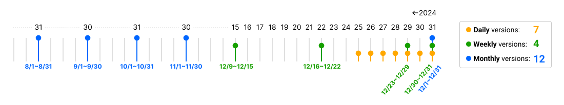 At the end of 2024, we will have the following versions retained:- 7 daily versions, one for each of the last 7 days