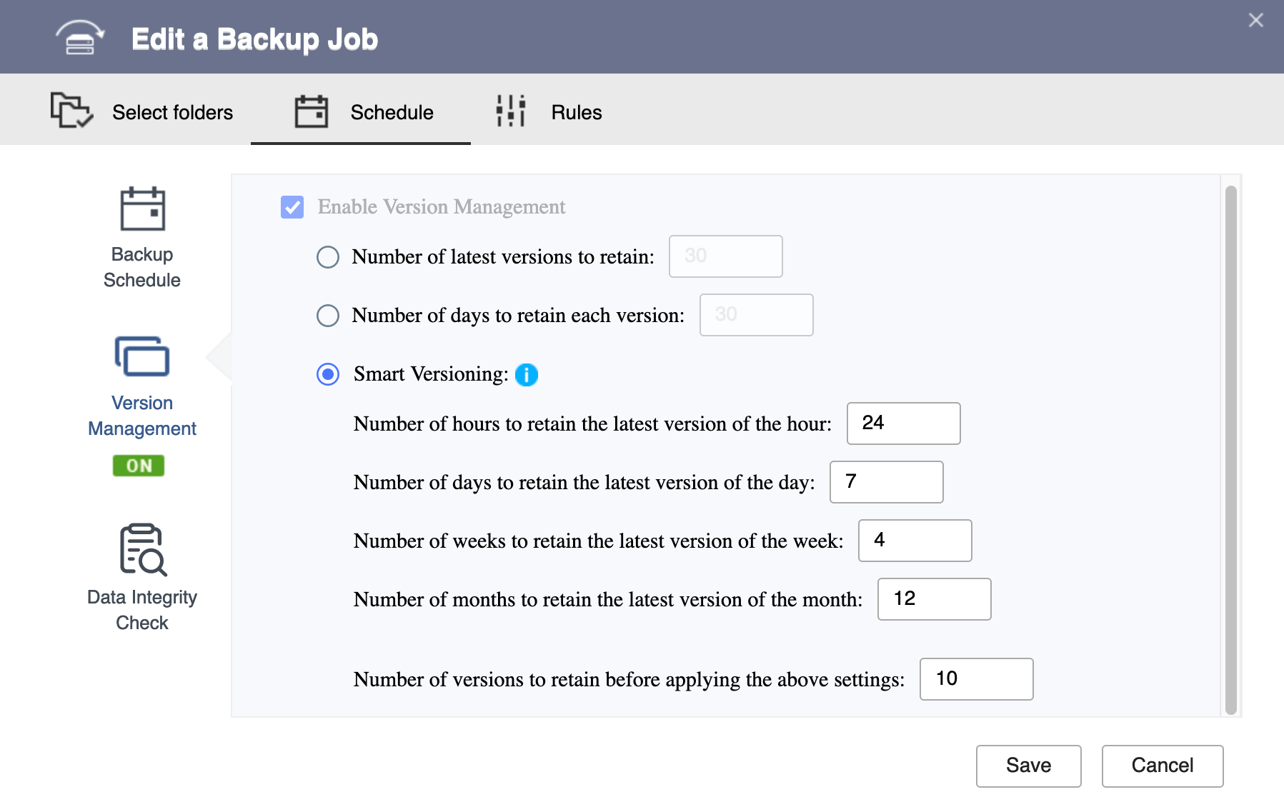 In Hybrid Backup Sync (HBS 3), Smart Versioning works by creating regular backups and retaining them for a specified length of time. When configuring Smart Versioning, you need to set time periods for several different settings: