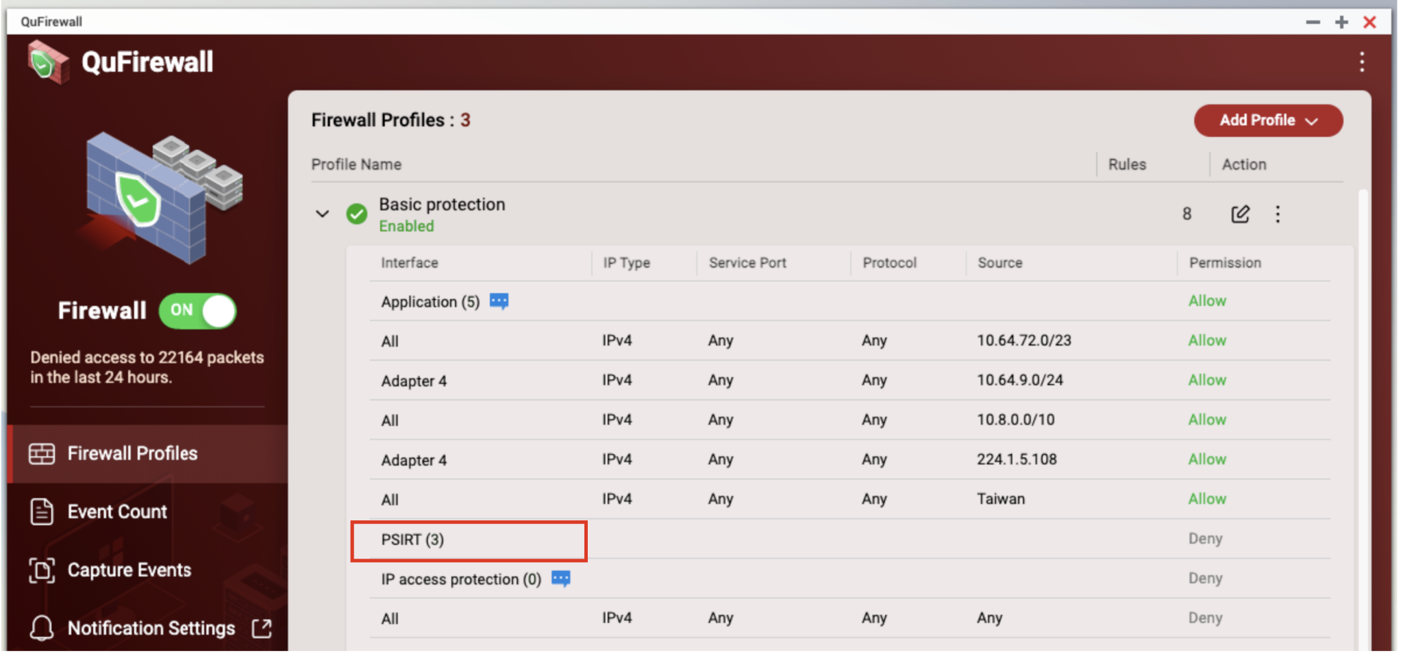 PSIRT in Basic Protection of QuFirewall is a list of IP addresses that are blocked due to their association with malware and other malicious activities.