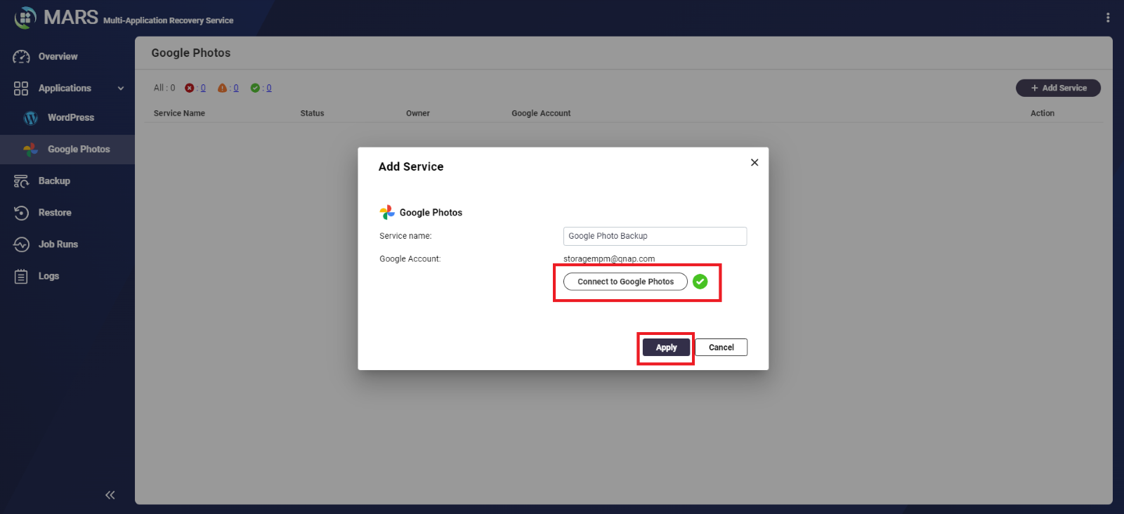 A green check mark appears indicating MARS has successfully connected to your Google Account. - Click Apply.