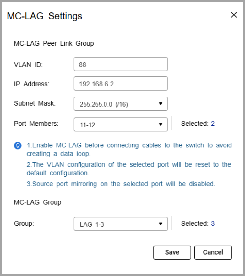 Select LACP to ensure automatic negotiation and failover for stable MC-LAG operation.Port Configuration Specifies which ports are included in the group NoteEnsure that you configure the same settings for all the member ports in a LAG. - Click Save.NoteMake sure the same LAGs are configured on both switches.