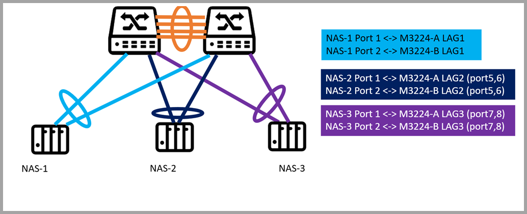 - NAS-1 -> LAG1: Ports 1 and 2 on both switches
