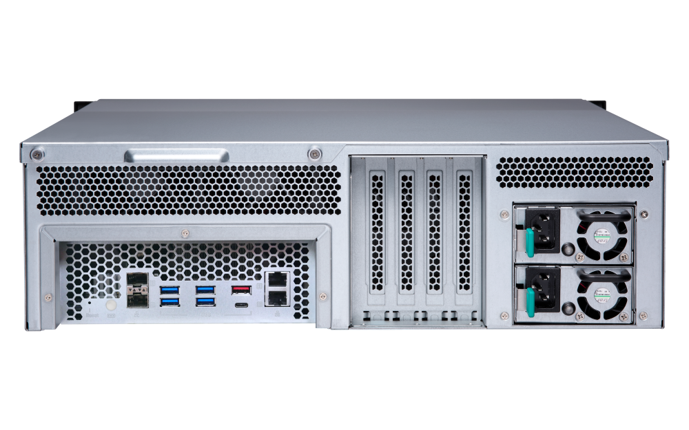 1 x Type-A USB 3.2 Gen 2 10GbpsForm Factor 3U Rackmount LED Indicators HDD 1-16, Status, LAN, storage expansion port status Buttons Power, Reset Dimensions (HxWxD) 130 × 481 × 573.5 mm Excludes ear hook and the protruding part of the Power Supply Unit.Weight (Net) 15.26 kg Weight (Gross) 21.38 kg Operating Temperature 0 - 40 °C (32°F - 104°F) Storage Temperature -20 - 70°C (-4°F - 158°F) Relative Humidity 5-95% RH non-condensing, wet bulb: 27˚C (80.6˚F) Power Supply Unit 500W(x2), 100-240V Power Consumption: Operating Mode, Typical 136.45 W Tested with drives fully populated.Fan System fan: 4 x 92mm, 12VDC System Warning Buzzer Max. Number of Concurrent Connections (CIFS) - with Max. Memory 2500 Note: Use only QNAP memory modules to maintain system performance and stability. For NAS devices with more than one memory slot, use QNAP modules with identical specifications and refer to the hardware user manual to install compatible QNAP memory modules.