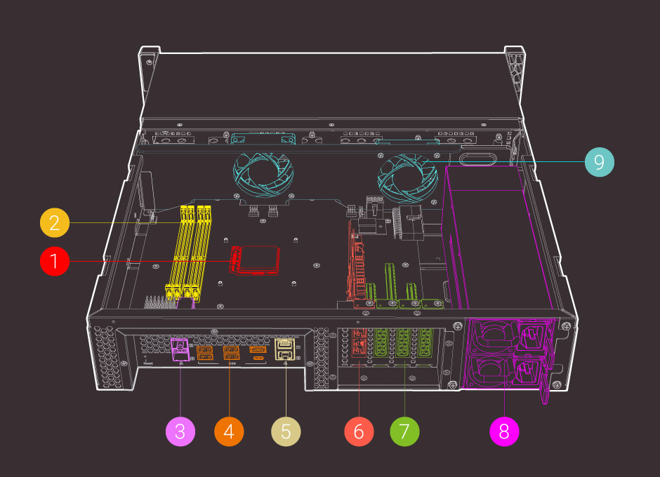 Supports 10GbE/ 25GbE/ 40GbE network expansion cards, QM2 cards, Fibre Channel cards, and SAS expansion cards for greater application potential. (Slot 4 comes with a pre-installed 10GbE adapter).