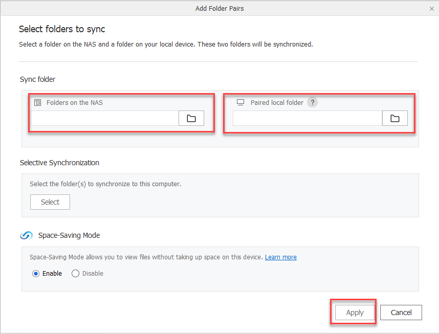 - En Sincronizar carpeta > Carpetas del NAS, especifique la carpeta del NAS.