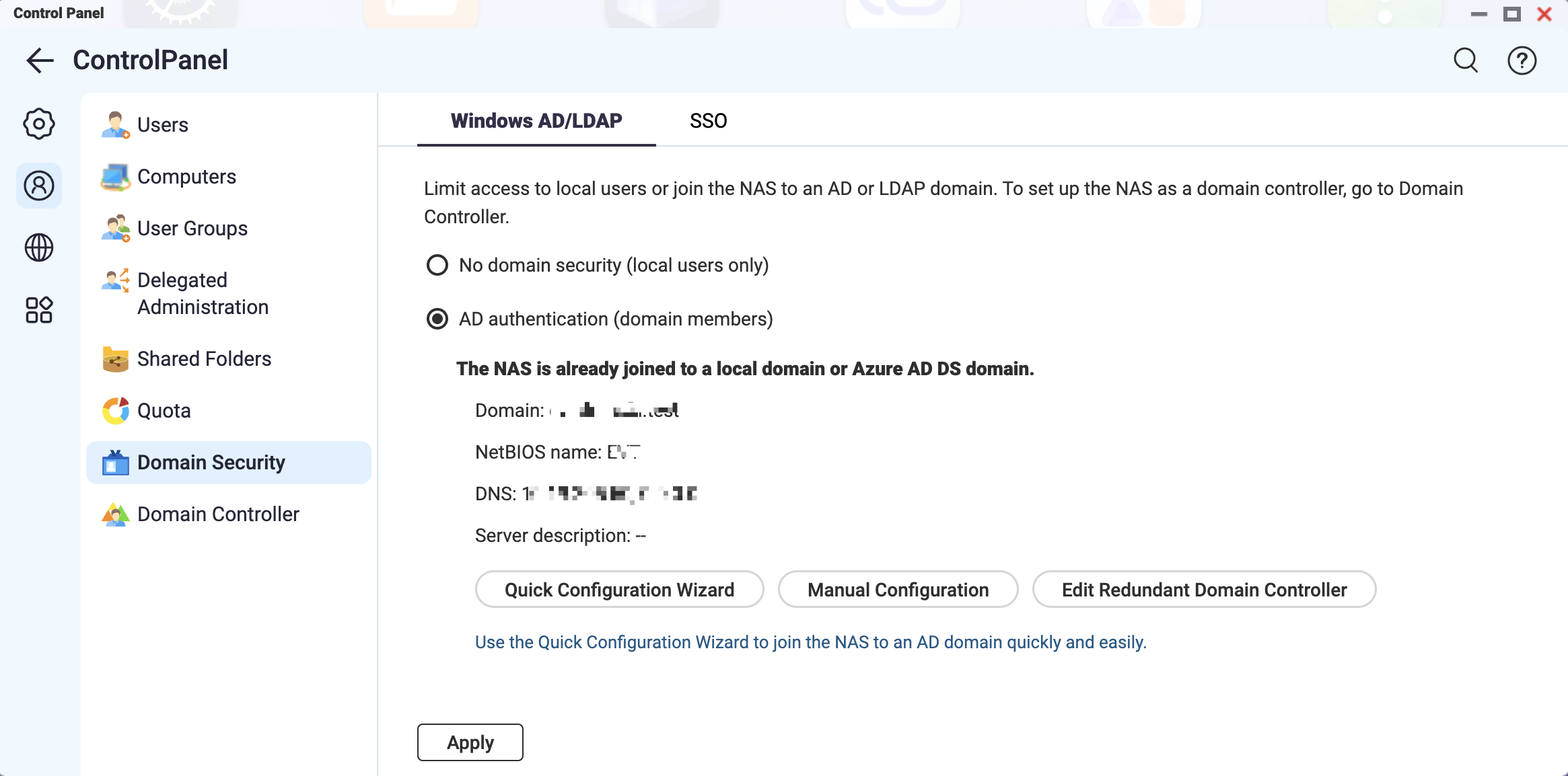 - Configure las opciones del servicio de dominio. Para más detalles, consulte los siguientes temas en el Guía del Usuario de QTS 5.x o Guía del Usuario de QuTS hero 5.x: