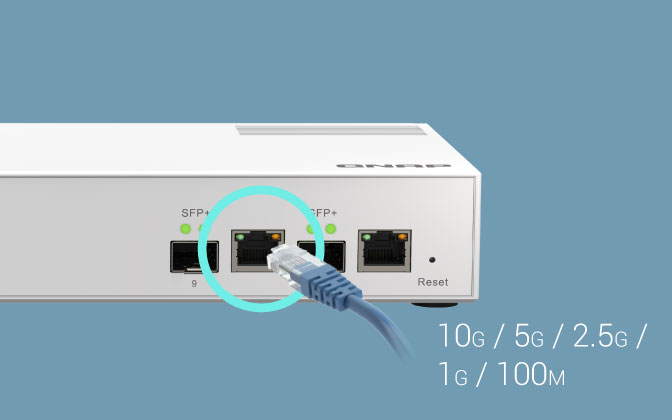 El QSW-M2108-2C es compatible con las tecnologías 10 GbE y NBASE-T para admitir cinco velocidades (10 G / 5G / 2,5G / 1 G / 100 M) utilizando los cables de Cat 5e y Cat 6a existentes. Los puertos combinados SFP+/RJ45 (cobre) proporcionan velocidades de transmisión más altas con cables existentes. Según el tipo de cable y su longitud, se pueden obtener diferentes velocidades para una transferencia de datos más rápida y eficaz.