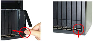 3. Inserte las bandejas de disco en el Turbo NAS y presione las bandejas de disco hasta el fi nal. Levante el dispositivo de bloqueo de la bandeja.