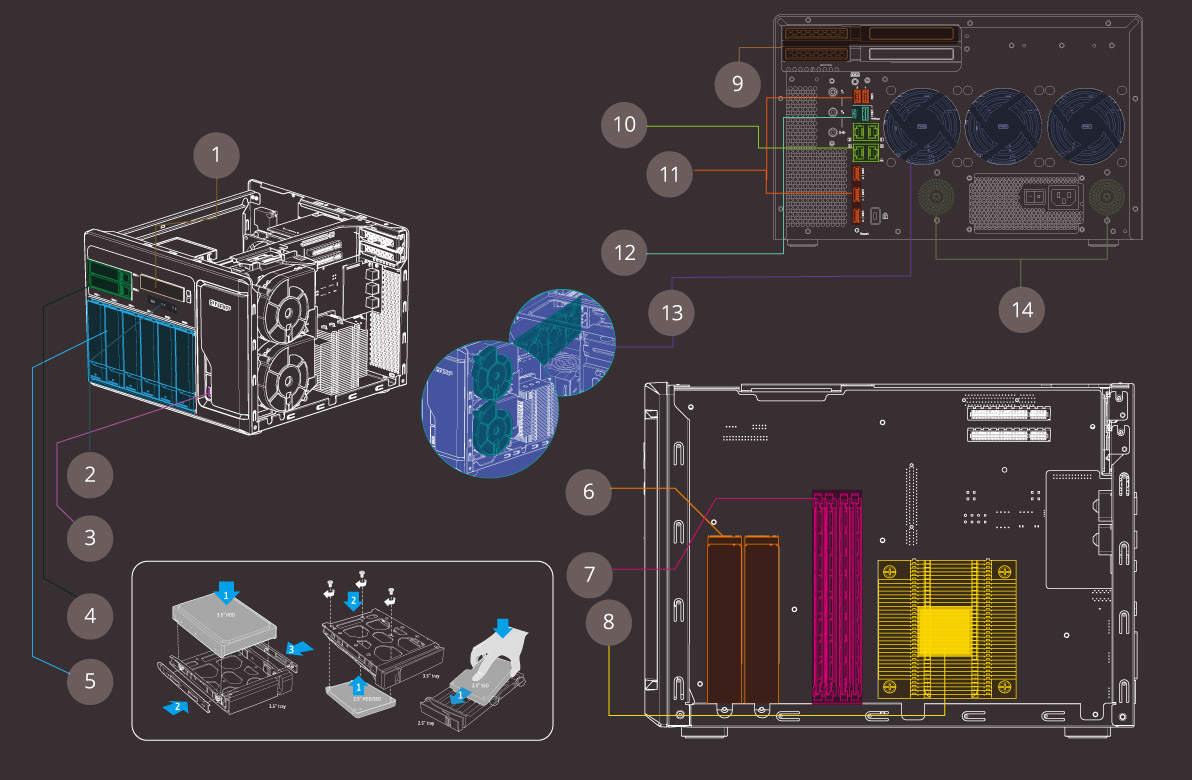 Las bandejas de SSD de 2,5” y las bandejas de disco duro de 3,5” ofrecen un diseño sin herramientas para una instalación y mantenimiento sencillos.