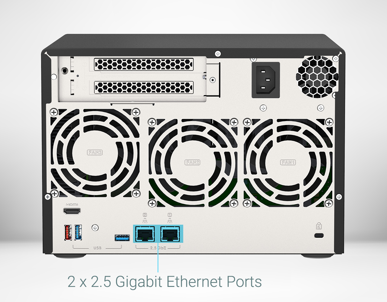Las dos ranuras PCIe Gen 3 permiten instalar adaptadores de 2,5/5/10GbE, tarjetas QM2 o tarjetas de expansión del almacenamiento QXP.