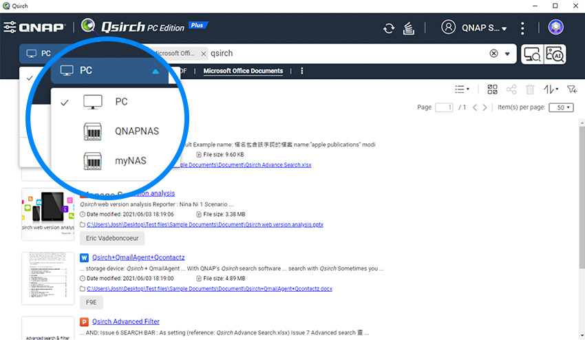 Qsirch PC Edition admite los tipos de archivos más comunes utilizados por las aplicaciones cotidianas, lo que le permite introducir simplemente palabras clave para encontrar archivos almacenados en su PC Windows y en su NAS.