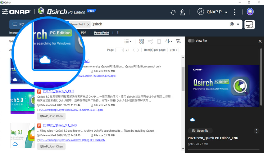 Con el aumento de la cantidad de datos y archivos utilizados tanto en los hogares como en los lugares de trabajo, es necesaria una solución moderna para encontrar archivos independientemente de dónde estén almacenados. Qsirch PC Edition le permite encontrar rápidamente archivos en su PC Windows y en su NAS utilizando un motor de búsqueda de texto completo con palabras clave, etiquetas y varios filtros.