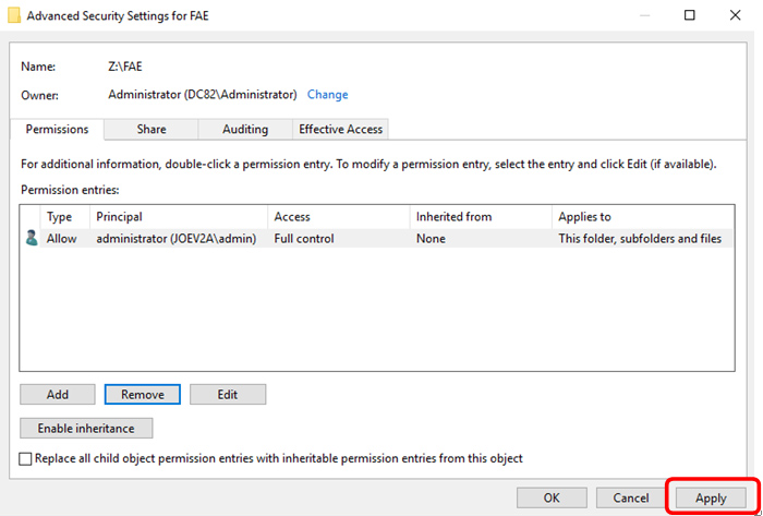 Except “Administrator”, remove other permissions entries