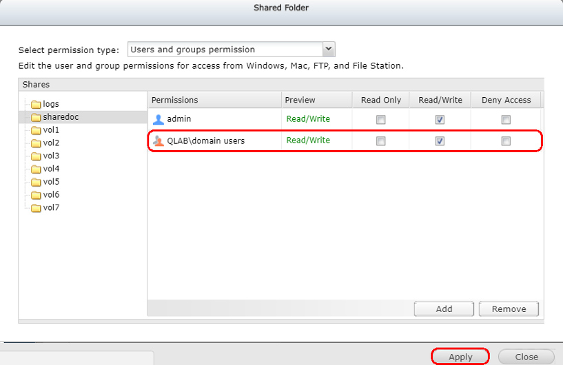 Select Domain Groups and assign the RW permission to domain users. Then click Add button.