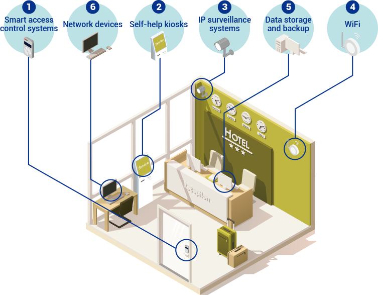 Si vous êtes propriétaire d’un Airbnb, vous et vos clients pouvez tirer profit d’un système de contrôle d’accès intelligent. Les clients peuvent s’enregistrer à l’aide des kiosques libre-service lors de leur arrivée tout en parcourant les détails des chambres et les packages de services. En tant que propriétaire Airbnb, vous devez proposer le Wi-Fi pour vos clients pour qu’ils puissent facilement vérifier les informations et contacter le service client via les téléphones VoIP. Les données d’enregistrement des clients doivent être sauvegardées en toute sécurité, et un système de surveillance IP est nécessaire afin de garantir la sécurité de l’environnement.