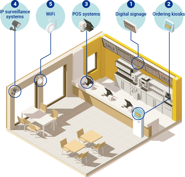 Si vous êtes propriétaire d’une franchise de restaurants, vous pourriez avoir besoin d’une signalétique numérique pour afficher les nouveaux menus ou les promotions en cours. Vous avez aussi besoin de vous assurer que le système POS soit connecté à tout moment afin de garantir que les données des ventes soient sauvegardées en toute sécurité. Un système de surveillance NVR est requis afin de garantir la sécurité de votre environnement et pour éliminer les litiges tels que les vols. De plus, votre restaurant doit proposer des services Wi-Fi pour ses clients