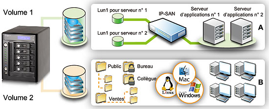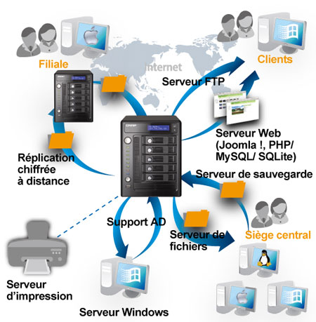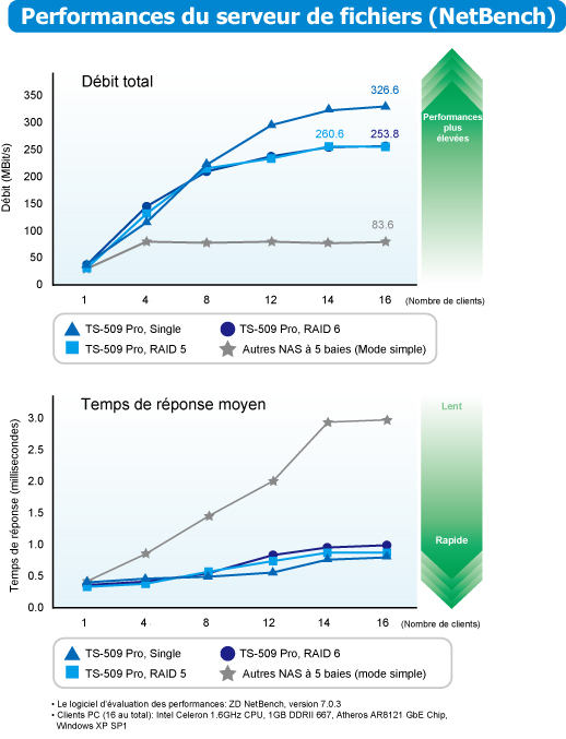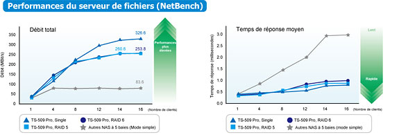 Les entreprises modernes ont besoin d'un centre de données centralisé pour la protection de l'ensemble de leurs données, la sauvegarde des données critiques, le partage de l'information parmi les groupes de travail et des différents services. Un système de sauvegarde solide, efficace et flexible est la clé pour s'adapter rapidement dans le milieu des affaires et une tâche d'une importance accrue pour les administrateurs de serveurs. Le serveur QNAP TS-509 Pro Turbo est la nouvelle génération de serveurs NAS tout-en-un pour les PME et les grandes entreprises. Ce NAS offre la solution de stockage la plus fiable et la plus puissante. Fort de ses performances améliorées, avec ses fonctionnalités de serveur modulables, sa protection de données en RAID la meilleure dans sa gamme, sans oublier un système ultra- stable permettant le changement à chaud de ses disques durs, le TS-509 Pro apporte à ses utilisateurs une meilleure expérience d'accès et de partage instantané des données, le stockage de masse sécurisé, des fonctionnalités de serveur précieuses et un coût d'entretien extrêmement réduit. Grâce à son processeur Intel Celeron 1.6GHz, sa mémoire d'1 Go DDRII, ses 5 baies, ses fonctions d'échange à chaud, le NAS TS-509 Pro fournit des performances supérieures destinées aux multiples applications des affaires et de gestion d'accès simultanés intensifs. Le système d'exploitation Linux et les applications du TS-509 sont intégrés dans le module de mémoire flash DOM (Disk on Module) qui garantissent une meilleure stabilité. De plus, les deux ports Gigabit LAN peuvent être configurés en mode tolérance de panne (failover), en mode répartition de charges réseaux ou pour la connexion à deux différents sous-réseau afin d'obtenir plusieurs options de déploiement des affaires selon l'environnement réseau. Nouvelle interface utilisateur Redondance RAID avancée grâce à l'extension de capacité RAID en ligne et migration de niveau RAID en ligne Le TS-509 Pro prend en charge les configurations RAID 0/ 1/ 5/ 6/ 5 + Rechange et JBOD. Avec la capacité d'extension RAID en ligne, l'utilisateur peut choisir d'acheter les disques durs nécessaires aux besoins initiaux pour la configuration initiale du serveur et mettre à niveau vers des disques de plus grande capacité à l'avenir selon l'évolution des besoins. Avec la migration de niveau RAID en ligne, l'utilisateur peut débuter avec un disque dur, et ajouter d'autres disques ultérieurement pour améliorer le niveau RAID à l'avenir selon les données contenues. Il n'est pas nécessaire d'éteindre le serveur pendant le processus. La solution iSCSI la plus abordable et la plus flexible Le TS-509 Pro peut servir de NAS et de serveur cible iSCSI. La fonction de cible iSCSI intégrée offre une alternative abordable à l'IP-SAN (Storage Area Network ou stockage en réseau) pour les PME. Les gestionnaires du serveur peuvent mettre en place le NAS pour étendre la capacité de stockage pour les serveurs d'applications existants, tels que le serveur de base de données et le serveur de messagerie, de manière économique. En outre, la fonction innovante d' « allocation d'espace virtuel » (Thin Provisioning) est fournie, permettant aux gestionnaires du serveur de répartir de manière flexible la capacité du LUN (Logical Unit Number ou Numéro d'unité logique) iSCSI au début, quelle que soit la capacité du volume physique. Une protection sûre des données par un cryptage AES 256-bits basé sur le volume La fonction principale de 'cryptage basé sur le volumé' du TS-509 Pro sécurise les données du serveur par un cryptage AES 256 bits. Même si les disques durs ont été volés, il n'y a pas lieu de craindre des fuites de confidentialité puisque les données ne sont accessibles que via un mot de passe autorisé. Installation facile, coûts d'entretien réduits L'écran LCD du TS-509 est très pratique et offre aux administrateurs réseau un accès rapide et facile pour l'initialisation du NAS et pour la configuration RAID sans devoir passer par un ordinateur. Les informations système et les configurations sont également affichées pour une gestion facile. La fonction de marche/arrêt planifié est disponible sur le nouveau TS-509 Pro et permet aux administrateurs réseau une gestion flexible des plages de fonctionnement du NAS selon les horaires de travail. La fonction de démarrage à distance (Wake on LAN) est également prise un charge pour une réactivation des serveurs à distance dans le réseau local.  La performance NAS au service des professionnels Des performances exceptionnelles NetBench est un logiciel qui évalue les performances d'un serveur de fichiers pendant le traitement des échanges Entrées/Sorties. Ce logiciel est un indicateur utile des performances du NAS/ serveur de fichiers lorsque plusieurs utilisateurs y accèdent simultanément.  Les résultats des tests ont montré que le TS-509 Pro fournit de hautes performances (plus de 300Mbp/s pour 16 clients), sous la configuration de disque simple. Les autres marques de NAS de même catégorie ont atteint que la moitié, voire moins, du débit atteint par le TS-509 Pro de QNAP. Ce résultat montre les performances du TS-509 Pro en tant que meilleure solution de serveur de fichiers pour les professionnels. Double système d'exploitation sur module de mémoire flash DOM intégrant la fonction de basculement de sécurité Le système d'exploitation et les applications sont intégrés dans le DOM. Le TS-509 Pro permet le lancement de son système sans devoir passer par un disque dur. Cette procédure permet de prévenir un échec de démarrage pour cause de secteurs déficients, d'erreurs fichiers ou d'échec de disque dur. Deux systèmes d'exploitation sont intégrés dans le module de mémoire DOM et démarrent le TS-509 PRO en alternance. Si un système plante, l'autre se substituera au premier pour le démarrage et lancera une reco