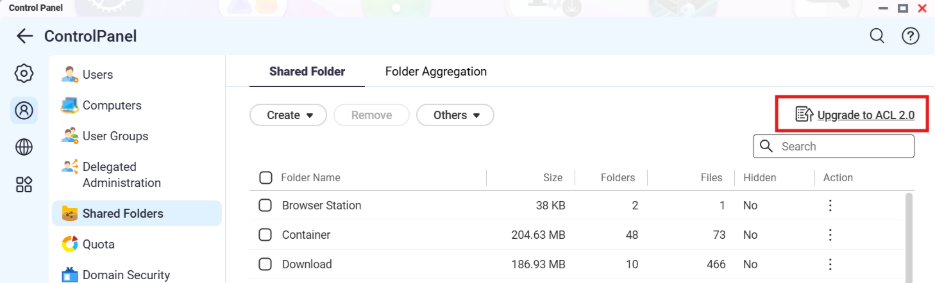 QuTS hero now supports upgrading ACL (Access Control List) to 2.0 to enhance ACL performance. This upgrade significantly improves the performance of checking or configuring permission settings for a large number of files and folders. In addition, it also increases the limit of configurable ACL entries, thus further enhancing permission management flexibility for larger organizations.