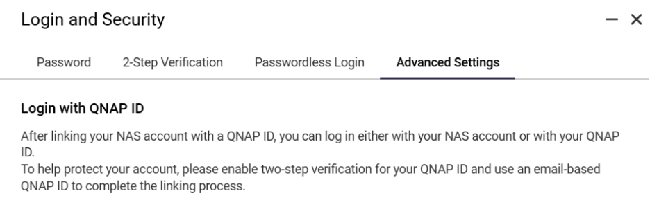 To streamline your login experience, you can now log in to the NAS with your QNAP ID. To do so, you can link your QNAP ID to a local or domain account for a NAS device. For better account security, you should enable 2-step verification for your QNAP ID before linking with a NAS account.
