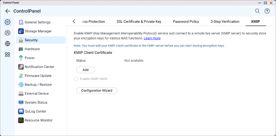 To configure KMIP service, you must first install KMIP Client in App Center, and then go to Control Panel > System > Security > KMIP.