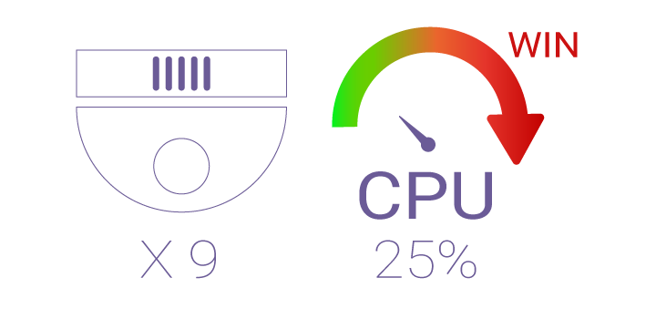 Lors de la conversion des images fisheye avec un logiciel de surveillance commun, la charge du processeur de l’appareil peut monter jusqu’à 75 %. Néanmoins, grâce à QVR Pro Client, la charge du processeur de l’appareil atteint seulement 25 % même lorsqu’il convertit simultanément neuf canaux.