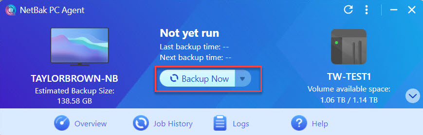 For details on creating backup jobs, see the section "Back Up Your Windows PC or Server" in How do I back up and restore my Windows PC or server with NetBak PC Agent?TipBackup jobs for your devices can be managed in HDP. - After creating the backup job, run the backup job by clicking Backup now.WarningWhile your PC/server is being backed up: