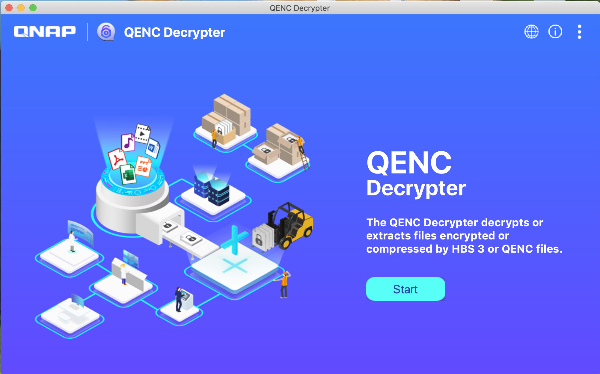 Files that have been encrypted and compressed using Hybrid Backup Sync (without deduplication) can also be decrypted and decompressed using the QENC Decrypter.
