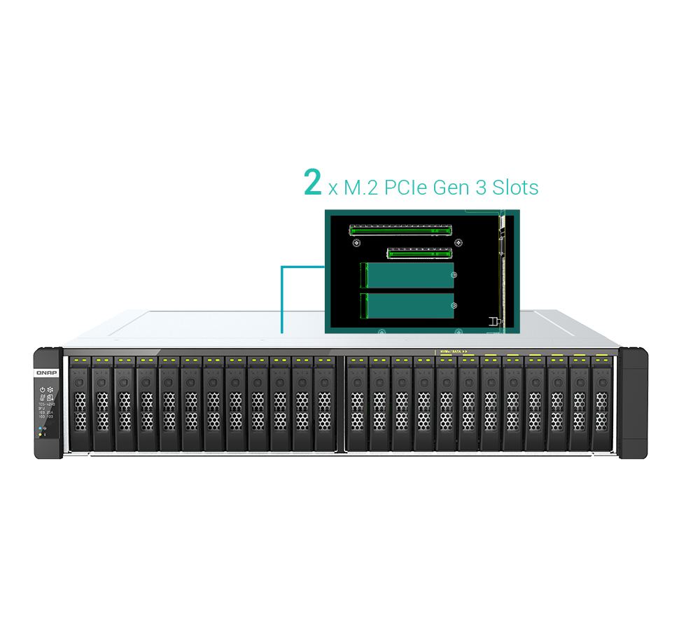 The TDS-h2489FU R2 has four PCIe Gen 4 slots, which have twice the bandwidth of PCIe Gen 3, enabling seamless expansion of NAS functionality to support diverse applications.