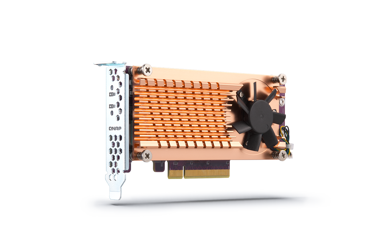 QM2 series PCIe cards add support for M.2 NVMe SSDs to a QNAP NAS, allowing users to configure SSD caching, a caching pool, or an auto-tiering volume to improve overall NAS performance.