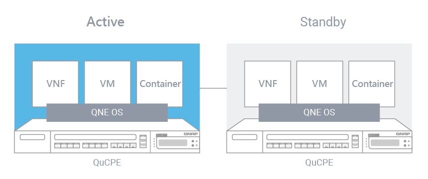 By installing and configuring HA Manager App, QuCPE-3034 supports Active-Standby High Availability system which enables failover from a primary QuCPE host to a secondary QuCPE host equipped with the same services. Without onsite maintenance, Device HA technology guarantees near-zero service downtime on QuCPE.