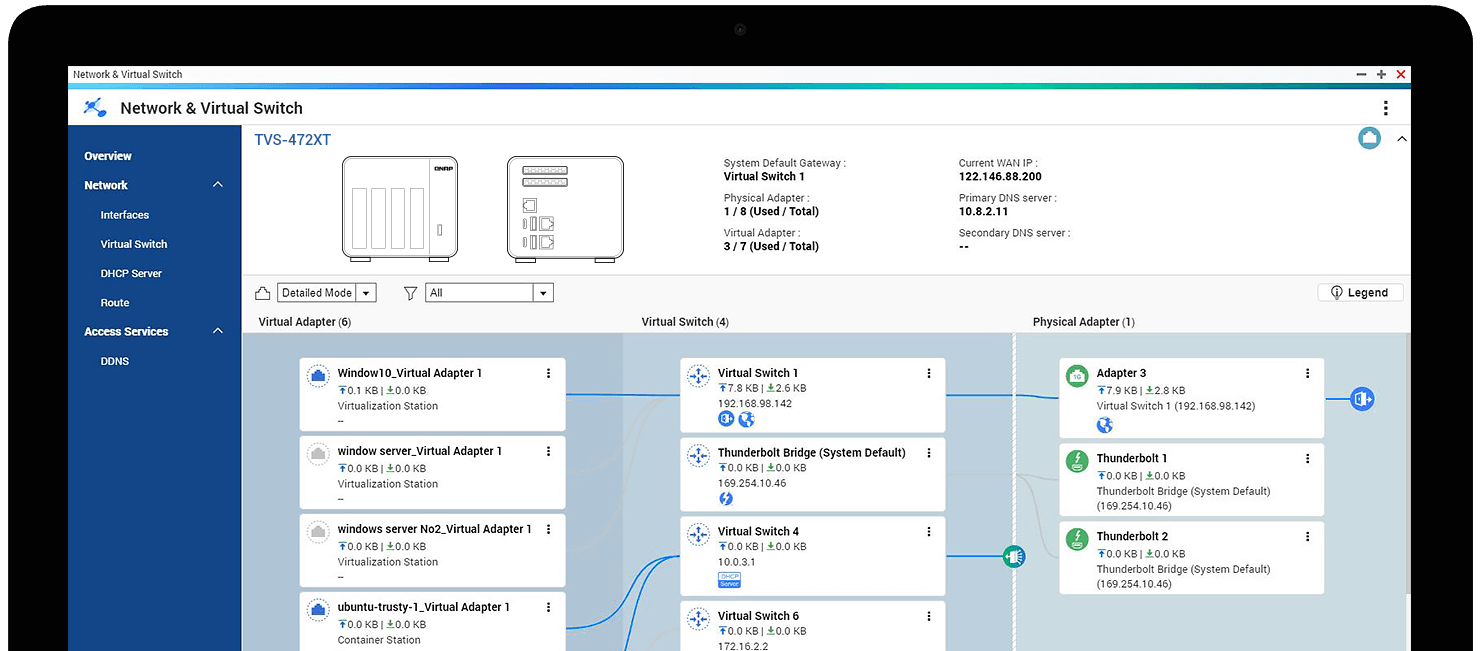 The Network & Virtual Switch app manages physical network interfaces (including network adapters and Thunderbolt™ ports) and virtual adapters (virtual machines and containers) and their communications, providing a visualized topology that clearly presents the connections of physical and virtual networks. The flexible manageability enables you to reorganize physical and virtual network connections with greater ease, so you can allocate adequate network resources to the TVS-472XT, virtual machines and containers whenever needed.