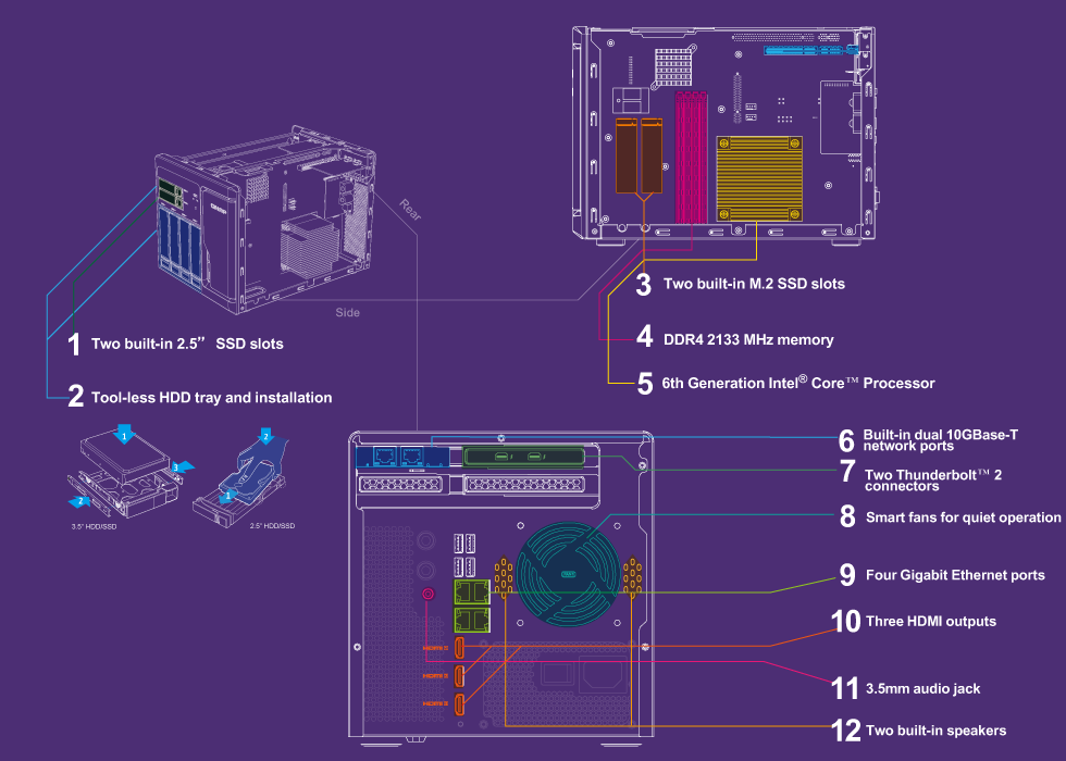 The TVS-682T is powered by a high-performance Intel® Core™ i3 dual-core processor and 8GB DDR4 RAM, driving outstanding system performance for CPU-demanding applications. Offering a comprehensive DAS/NAS/iSCSI SAN multi-mode storage solution in a compact form factor, the TVS-682T not only features Thunderbolt™ 2 technology but also has dual 10GbE ports giving you incredible flexibility for network connectivity.