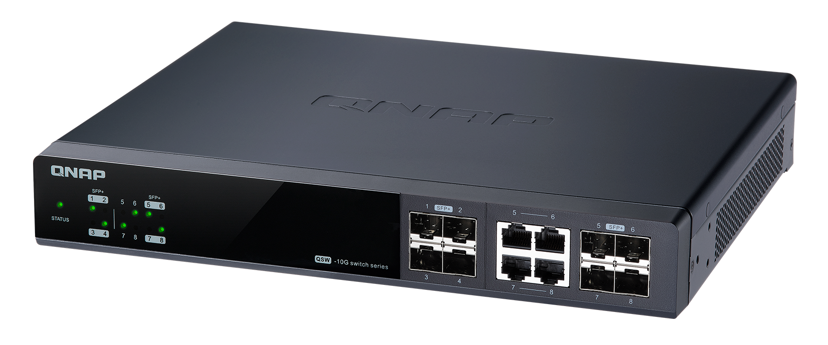 A 8 portos QSW-M804-4C switch négy SFP+ (üvegszálas) porttal és négy SFP+/RJ45 (réz) kombinált porttal rendelkezik a különféle interfészek összekapcsolásához. Az RJ45 interfész támogatja a 10GbE csatlakozást a Cat 6a (vagy újabb) kábelekkel. A Direct Attach Copper (DAC) kábelek az SFP+ portokkal használhatók a szerverek rack szekrényen belüli csatlakoztatásához. A QSW-M804-4C teljes kapacitása 240 Gbps, így garantálja minden port teljes kihasználásának lehetőségét. A QSW-M804-4C kompatibilis a 10GbE és az NBASE-T technológiákkal, amelyek akár öt sebességet is támogatnak (10G / 5G / 2,5G / 1G / 100M). Az SFP+/RJ45 (réz) kombinált portok a meglévő kábelekkel nagyobb átviteli sebességet biztosítanak. A kábel típusától és hosszától függően eltérő sebességeket lehet elérni a gyorsabb és hatékonyabb adatátvitel érdekében.