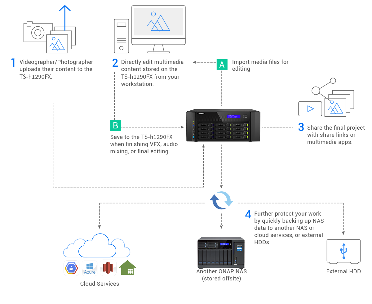 A TS-h1290FX ideális megoldást kínál a videószerkesztő csapatok számára, köszönhetően az olyan népszerű szoftverekkel való teljes körű kompatibilitásának, mint az Adobe Premiere, a Final Cut Pro X és a DaVinci Resolve. A nagy sávszélességet igénylő feladatokra, mint például a 4K/8K videószerkesztésre vagy a közös szerkesztésre, a TS-h1290FX egyaránt segítséget nyújt Neked és a csapatodnak is.