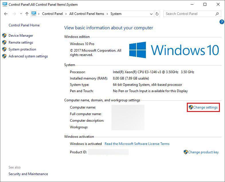 Viene visualizzata la schermata Sistema. - In Impostazioni nome computer, dominio e gruppo di lavoro, fare clic su Cambia impostazioni.
