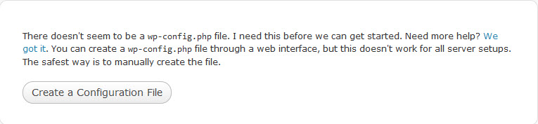 Se questa e la prima volta che installate WordPress, apparira il messaggio qui sotto, dopo aver cliccato sul collegamento 'Pagina Web' dalla pagina QPKG. Cliccare semplicemente 'Creare un File di Configurazione' per accedere al passaggio successivo.