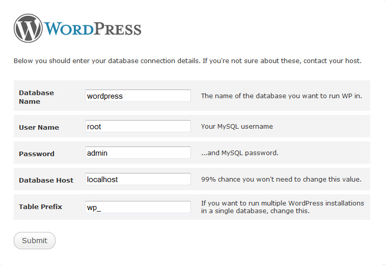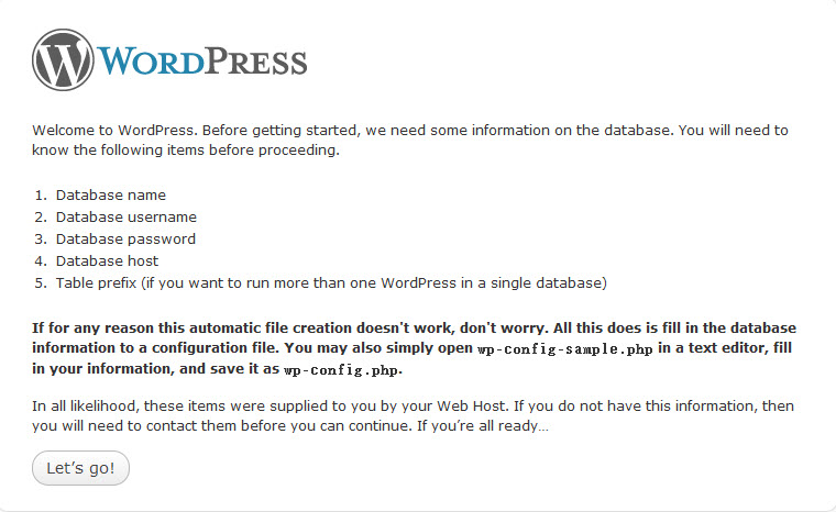 A partire dal passaggio precedente abbiamo raccolto informazioni di database per linstallazione del WordPress, cliccare semplicemente sul pulsante 'Vai!' per accedere al passaggio successivo.