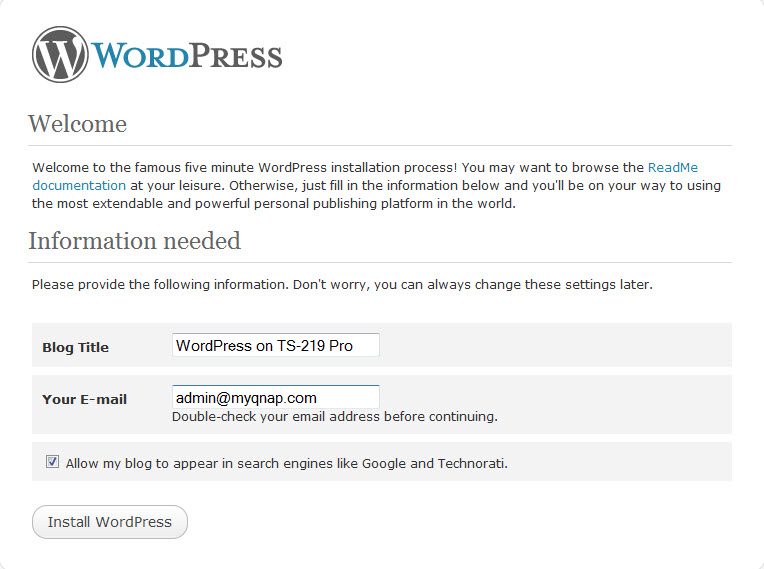 Successivamente digitare il titolo del vostro primo blog ed indirizzo e-mail. La casella di controllo in basso serve per specificare se si desidera o meno che il proprio blog appaia nei risultati di ricerca di Google o Technorati. Ora sembra che abbiamo tutti i dettagli necessari richiesti per linstallazione. Cliccare ora su 'Installa WordPress' per iniziare linstallazione.