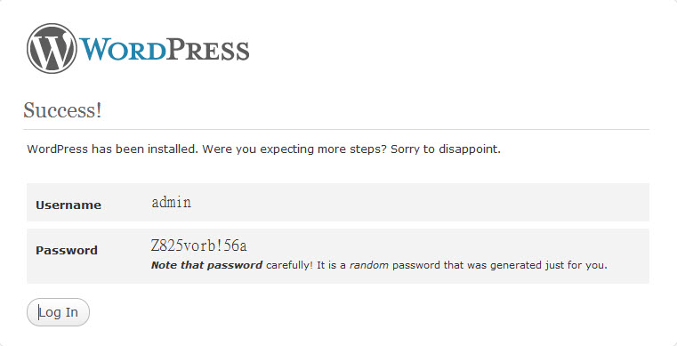 Se linstallazione e stata portata a termine con successo, dovrebbe apparire una pagina uguale a quella mostrata qui sotto. WordPress creera un account di amministrazione di default con relativa password per eseguire il log in la prima volta. Annotare con cura questi dati. Successivamente, si potra eseguire il log in a WordPress cliccando su 'Log In'.