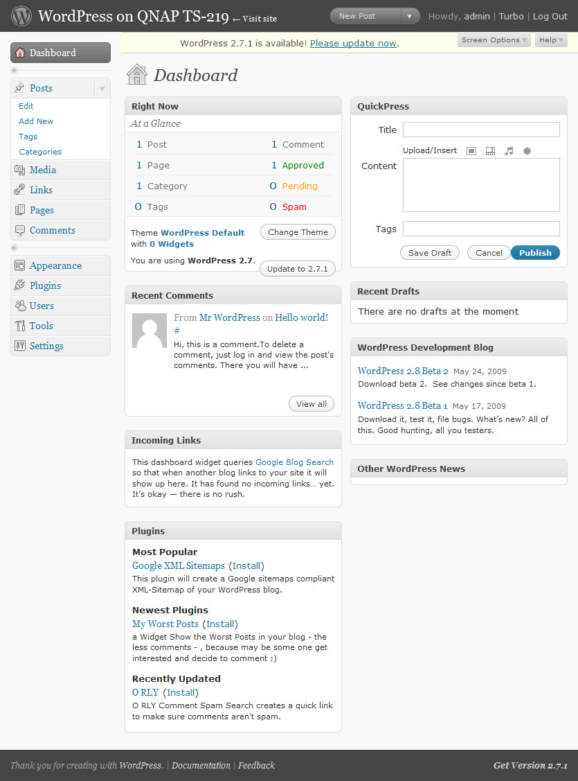 Una volta che la procedura di download e stata completata, per prima cosa decomprimere larchivio di file, poi passare ad 'Applicazioni' ->'QPKG Plugins' ->'Installazione' ed installare il file WordPress.qpkg con la stessa modalita con la quale si esegue laggiornamento di un firmware di sistema.