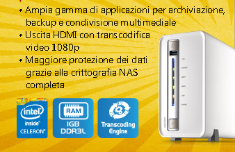 TS-251C: modello tower 2-dischi, processore Intel Celeron® Dual-core da 2.41 GHz, 1GB di RAM DDR3L; support per dischi fissi tradizionali in formato 3.5” SATA; 1 porta USB 3.0; 2 porte USB 2.0; 1 porta di rete Gigabit LAN; uscita HDMI (v1.4a, 1080p)