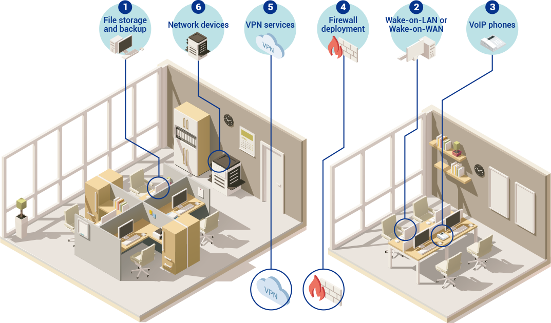 Nel caso di professionisti IT per le piccole aziende, spesso è necessario configurare i server file per tutti i dipendenti in modo da centralizzare l’archiviazione dei file. Sarà inoltre necessario creare reti per il collegamento delle apparecchiature dell’ufficio, come stampanti di rete e telefoni VoIP. La configurazione di un firewall è inoltre importante nella sicurezza delle informazioni per mitigare gli attacchi interi e le manomissioni esterne. Inoltre, è necessaria una connessione VPN per eseguire il trasferimento sicuro dei file remoti tra la sede centrale e le filiali.