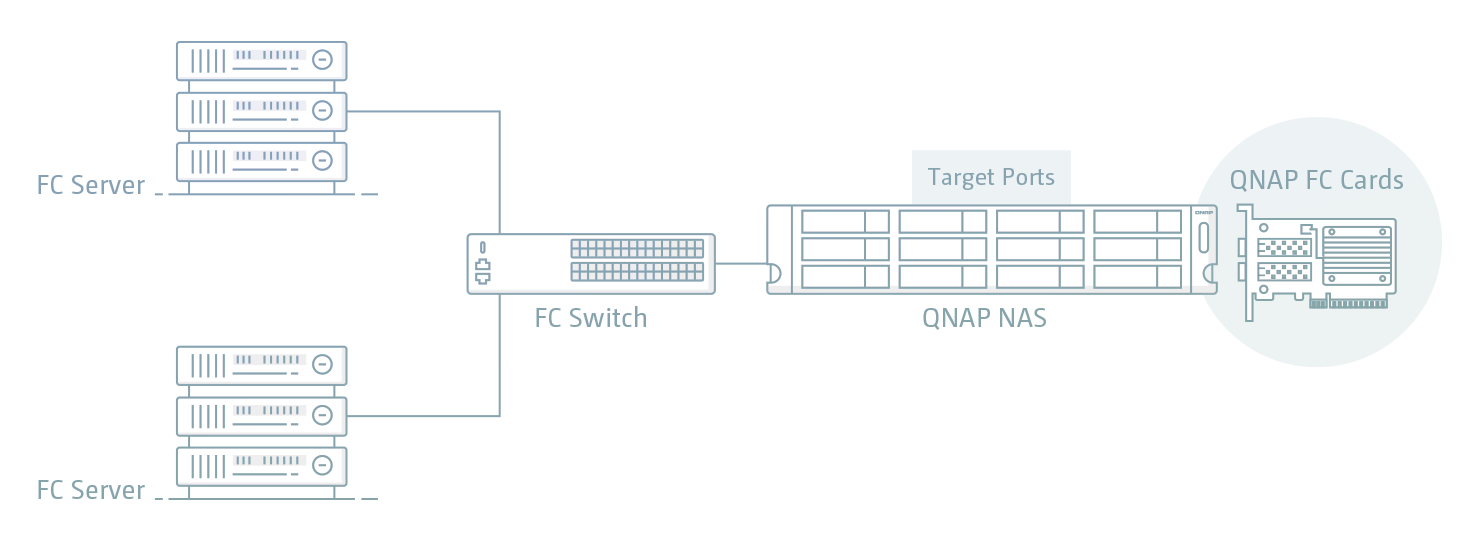 Usare l’applicazione QTS / QuTS hero iSCSI & Fibre Channel per impostare il QNAP NAS come Fibre Channel Target, e aggiungere il NAS all’ambiente SAN con gli indirizzi WWPN. È anche possibile sfruttare i vantaggi dello Fibre Channel Switch che consentono più percorsi di connessione per la condivisione del NAS con più server. Inoltre, le funzioni Masking LUN e Port Binding offrono un livello aggiuntivo di sicurezza dei dati.