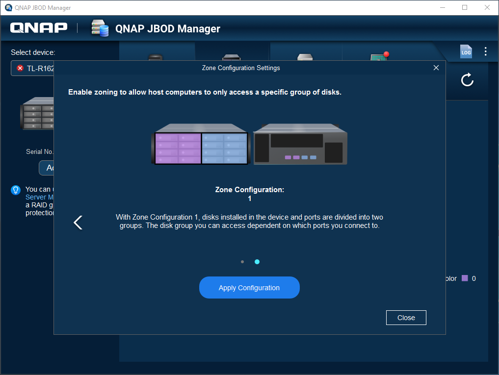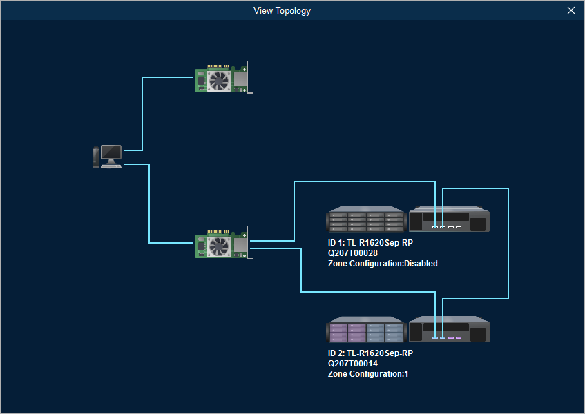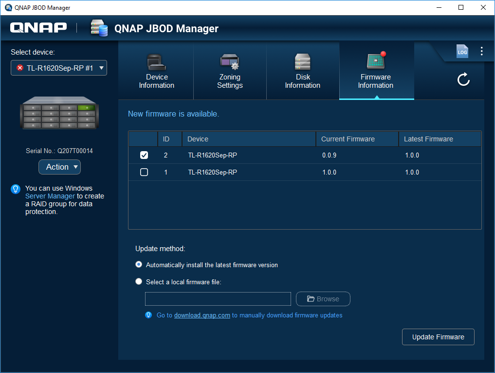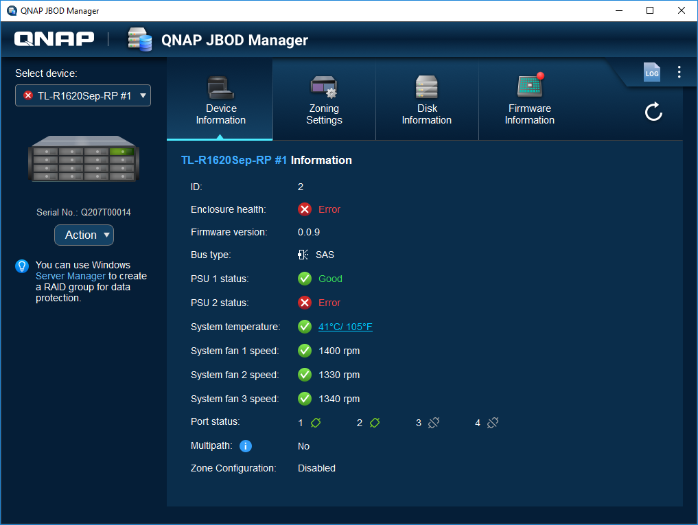 QNAP JBOD Manager offre una interfaccia facile da usare che consente di gestire intuitivamente il TL-R1220Sep-RP. Oltre alle informazioni sullo stato operativo, è anche possibile visualizzare la topologia del dispositivo collegato, configurare le impostazioni di SAS Zoning e gestire il firmware di tutti i TL-R1220Sep-RP collegati.